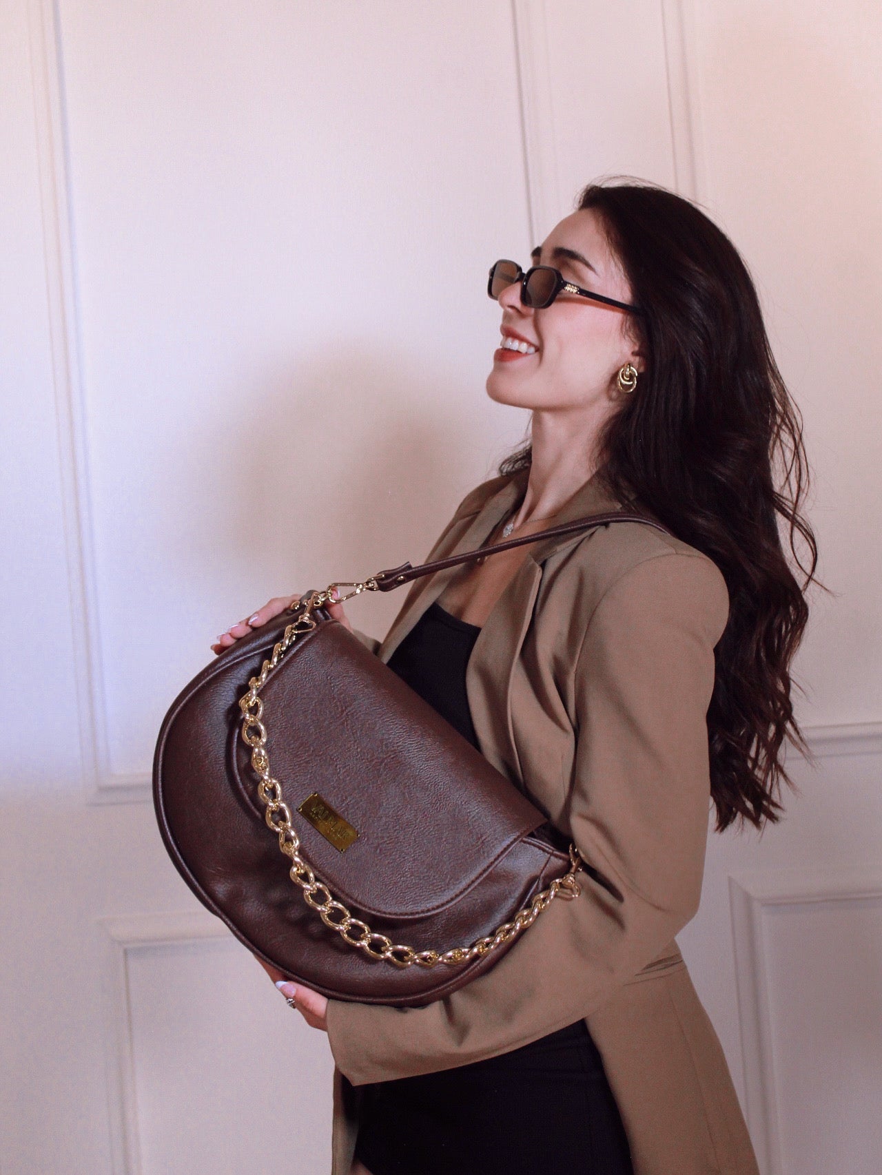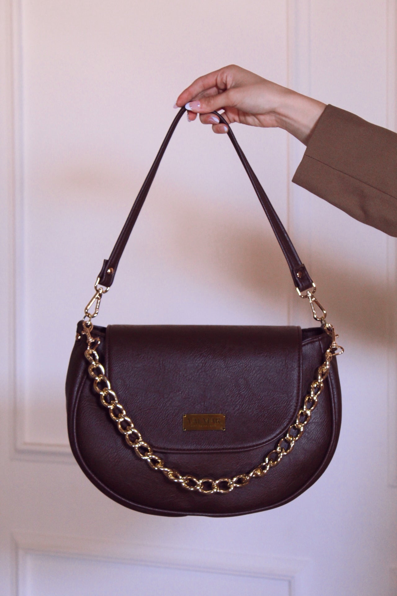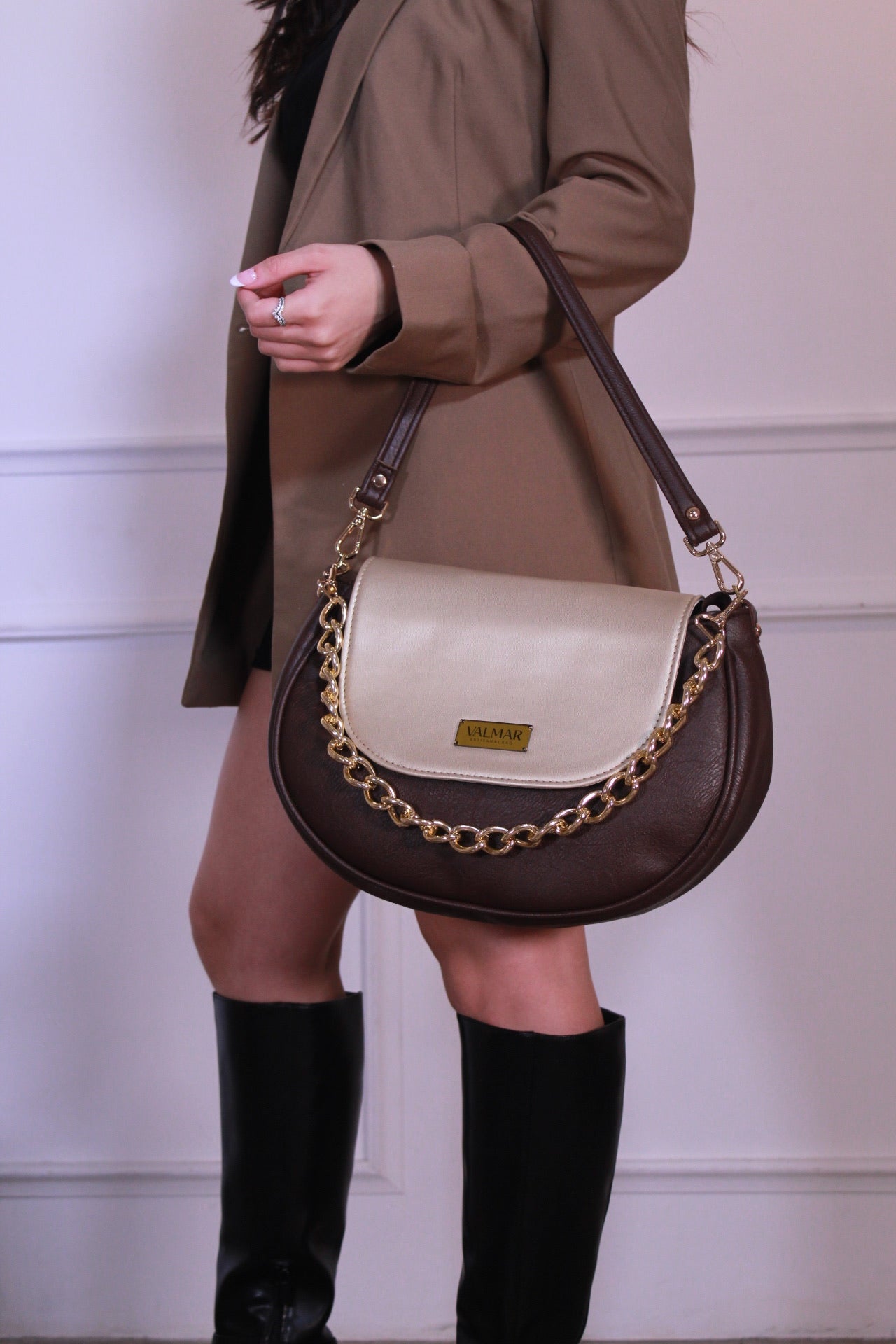 Diseñada para acompañarte en cada momento, la cartera Mauren ofrece un estilo versátil y sofisticado. Con dos tapas intercambiables en color chocolate y dorado mate, podrás transformar tu look de manera práctica y elegante. Sus tres tipos de uso de correas: cadena, shoulder bag y crossbody se adaptan a cualquier ocasión, combinando comodidad y estilo en un solo accesorio.